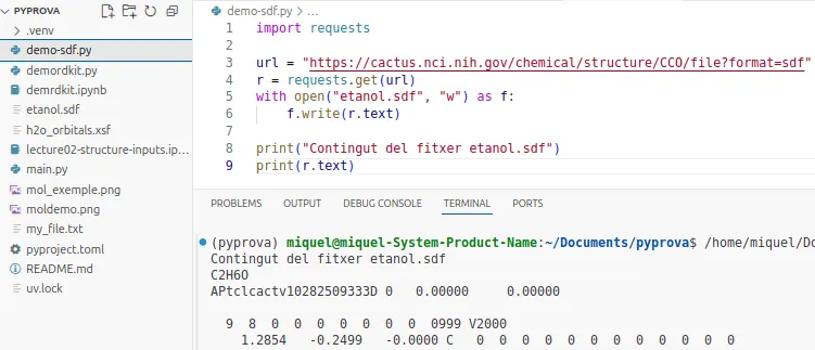 # Agafem les dades extretes d'Internet i les guardem al fitxer.with open("etanol.sdf", "w") as f: f.write(r.text)Ara, modifica el fitxer main.py amb totes les instruccions: