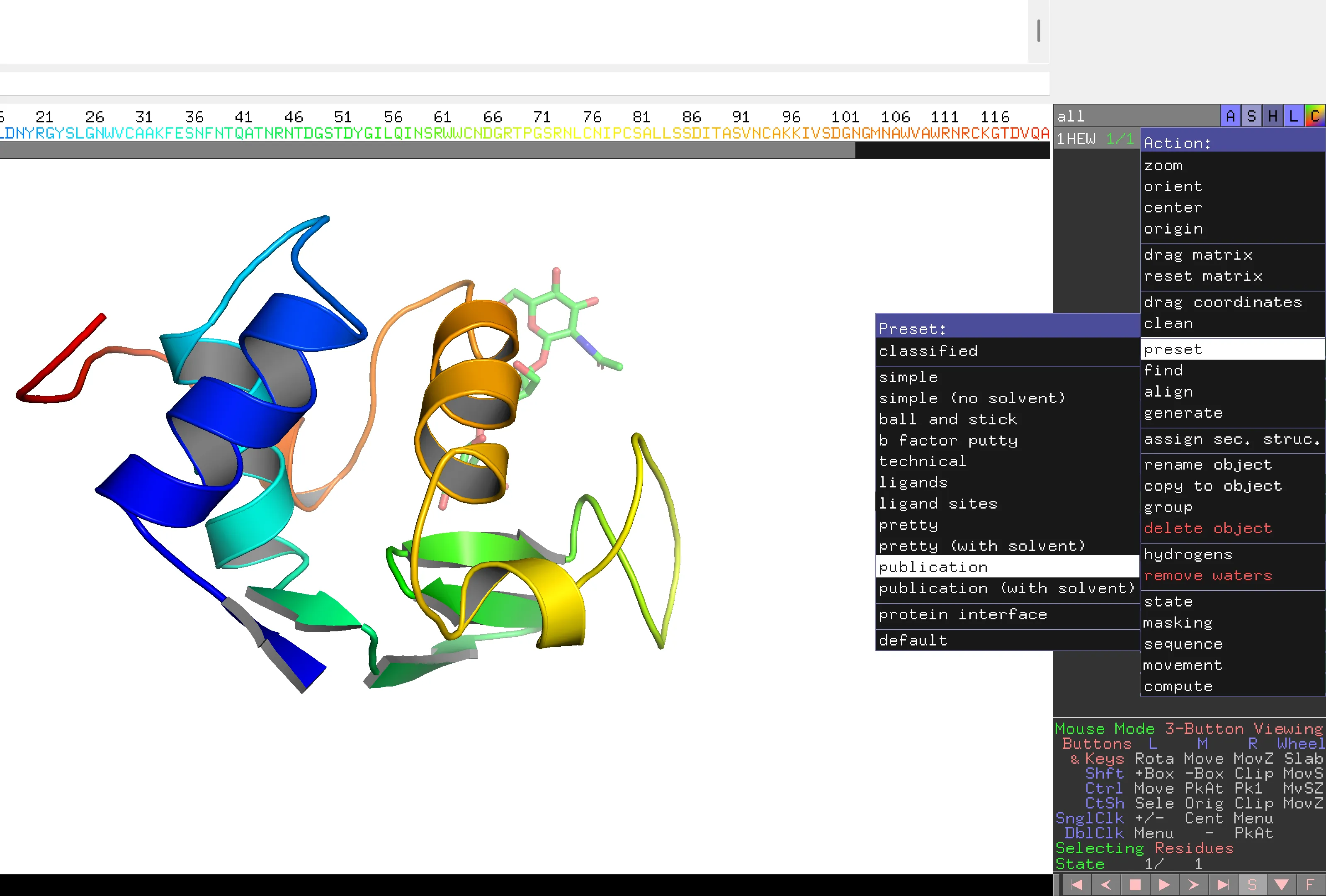 Si ho proves, observa com l’inhibidor trisacàrid es fa visible. Per tornar a la configuració anterior 1HEW ‘A’ > preset > default i repeteix els passos anteriors.