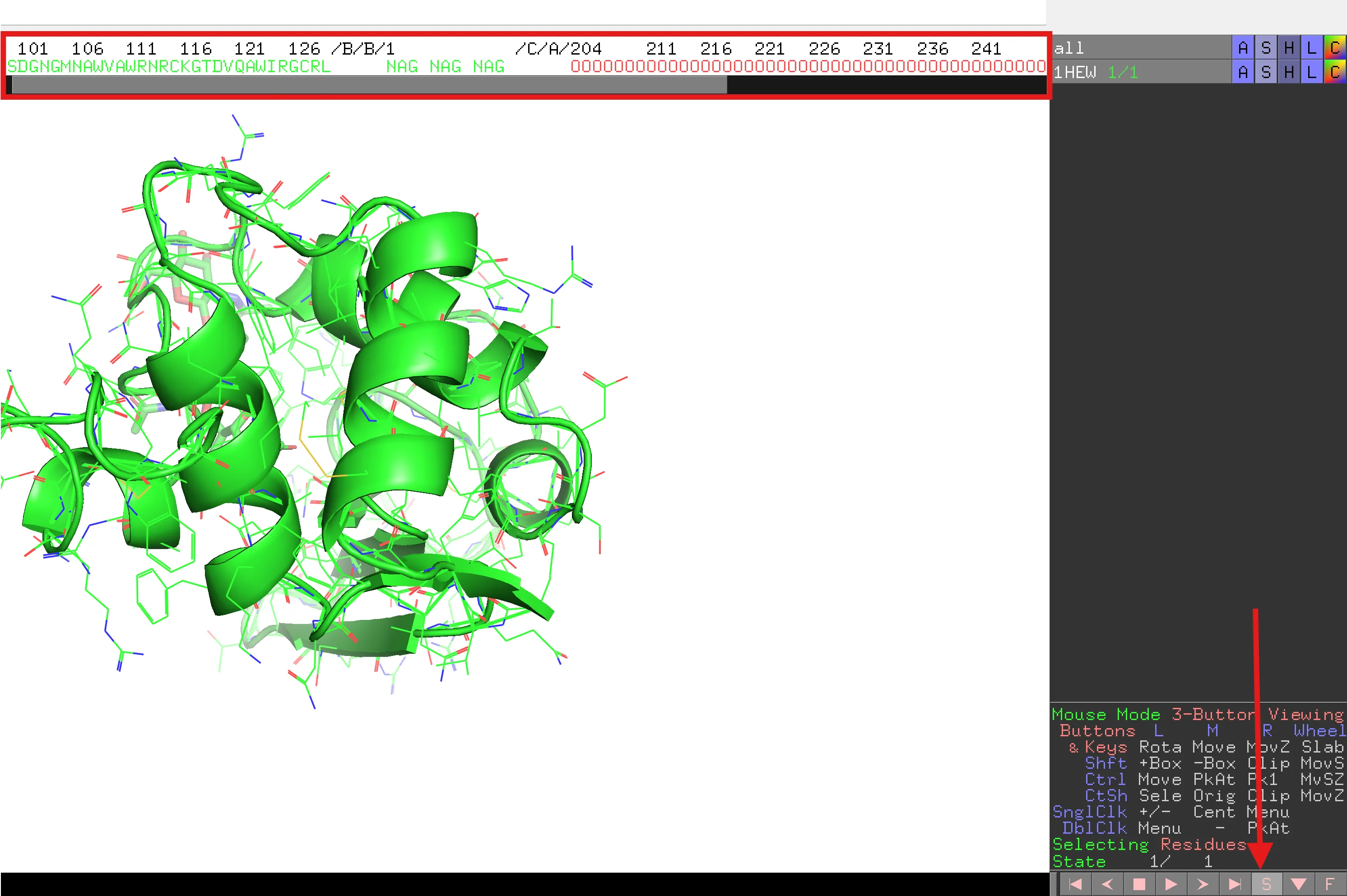 Utilitzant la barra de desplaçament, desplaça’t cap a la dreta per veure la resta de la seqüència de la proteïna i les altres lletres. El NAG són les unitats individuals de l’inhibidor trisacàrid i les O vermelles són les molècules d’aigua, comunament presents en estructures determinades per cristal·lografia de raigs X. Tot i que les aigües poden jugar un paper important en l’estructura i funció de les proteïnes, potser voldrem eliminar-les si cal. Podem amagar-les (vegeu més amunt) o eliminar-les completament. Les eliminarem per poder generar imatges fàcilment.