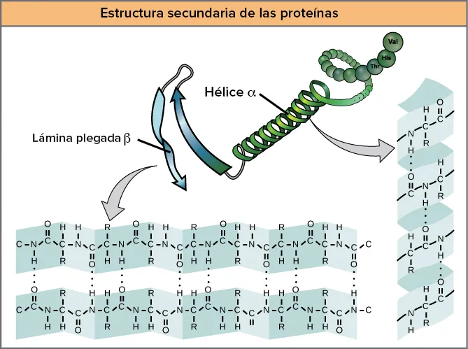 Tant les hèlixs α com les làmines β mantenen la forma mitjançant ponts d’hidrogen, que es formen entre l’O del grup carbonil d’un aminoàcid i l’H del grup amino d’un altre tal com pots veure en aquest dibuix: