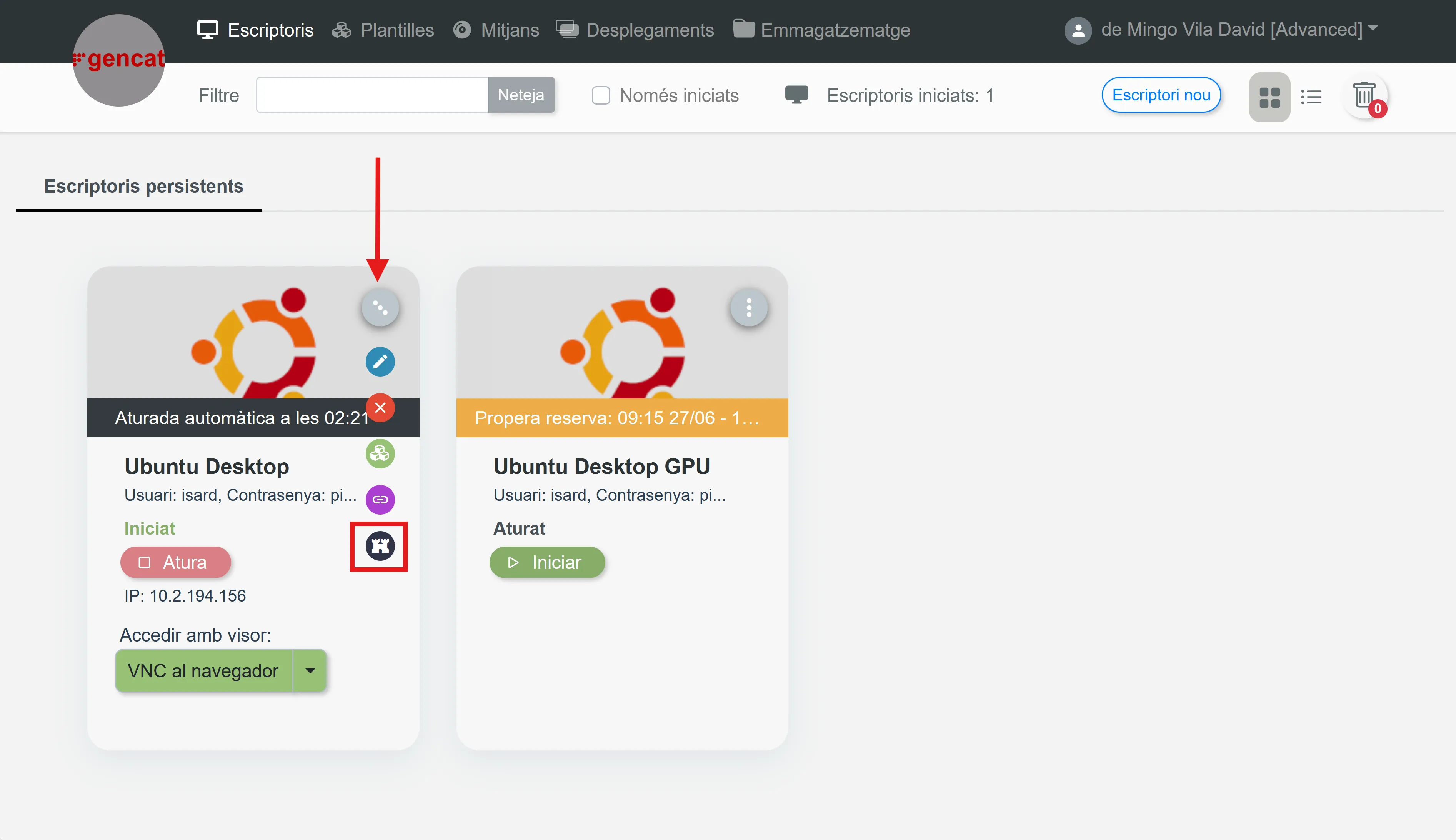 Accedeix al menú desplegable de l’usuari i selecciona l’opció VPN, que descarregarà el fitxer isard-vpn.conf a l’equip amfitrió.