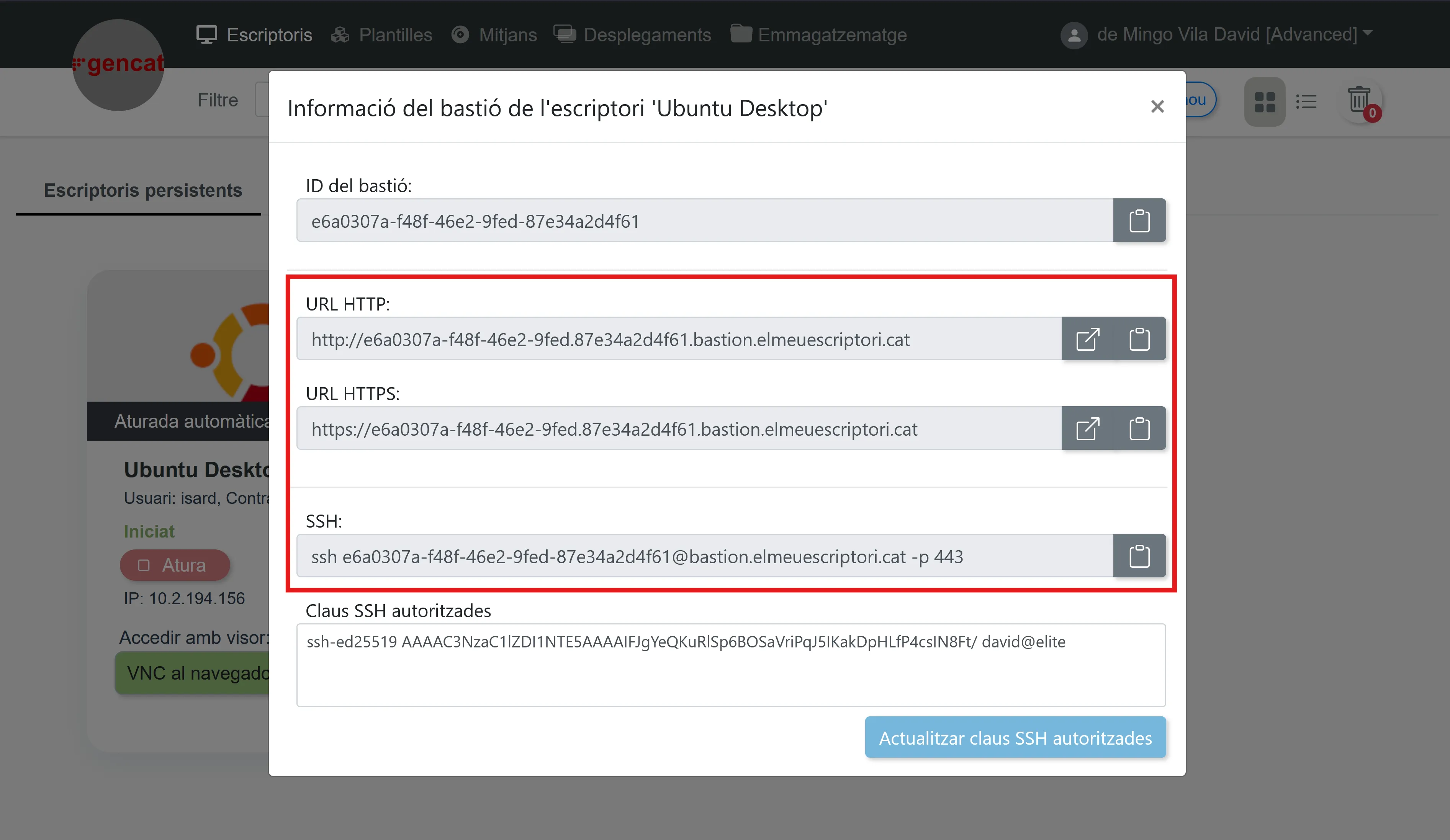 En l’apartat principal d’escriptoris, pots accedir al botó de bastion per veure el UUID juntament amb els URL per als protocols activats: