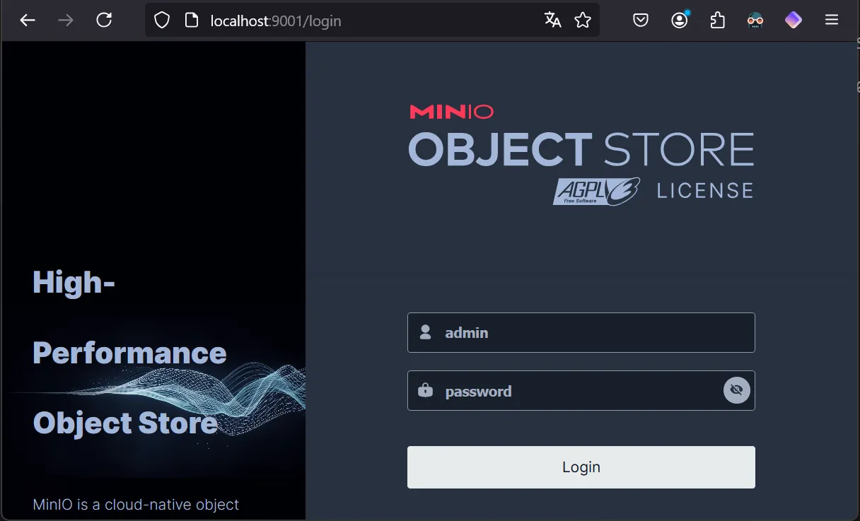 $docker psCONTAINER ID IMAGE COMMAND CREATED STATUS PORTS NAMESf5febb38a40d nginx:1.19.2-alpine "/docker-entrypoint.…" 2 minutes ago Up 2 minutes 80/tcp, 0.0.0.0:9000-9001->9000-9001/tcp, :::9000-9001->9000-9001/tcp docker-nginx-10cb9aff8e283 minio/minio:RELEASE.2023-10-16T04-13-43Z "/usr/bin/docker-ent…" 2 minutes ago Up 2 minutes (healthy) 9000-9001/tcp docker-minio4-1423e2031fe26 minio/minio:RELEASE.2023-10-16T04-13-43Z "/usr/bin/docker-ent…" 2 minutes ago Up 2 minutes (healthy) 9000-9001/tcp docker-minio3-1ea5e9ef653d2 minio/minio:RELEASE.2023-10-16T04-13-43Z "/usr/bin/docker-ent…" 2 minutes ago Up 2 minutes (healthy) 9000-9001/tcp docker-minio1-1ae4ec2bc445e minio/minio:RELEASE.2023-10-16T04-13-43Z "/usr/bin/docker-ent…" 2 minutes ago Up 2 minutes (healthy) 9000-9001/tcp docker-minio2-1Obre la consola http://localhost:9000
