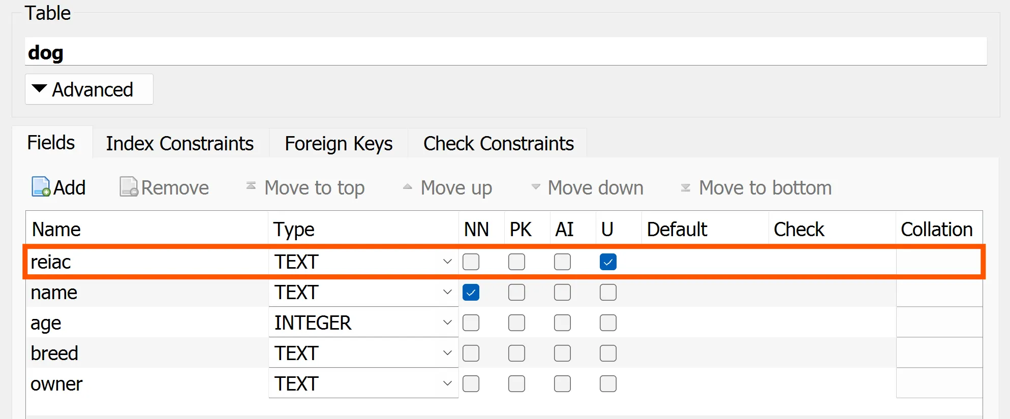 A continuació afegeix la restricció U (unique) a la columna reiac: