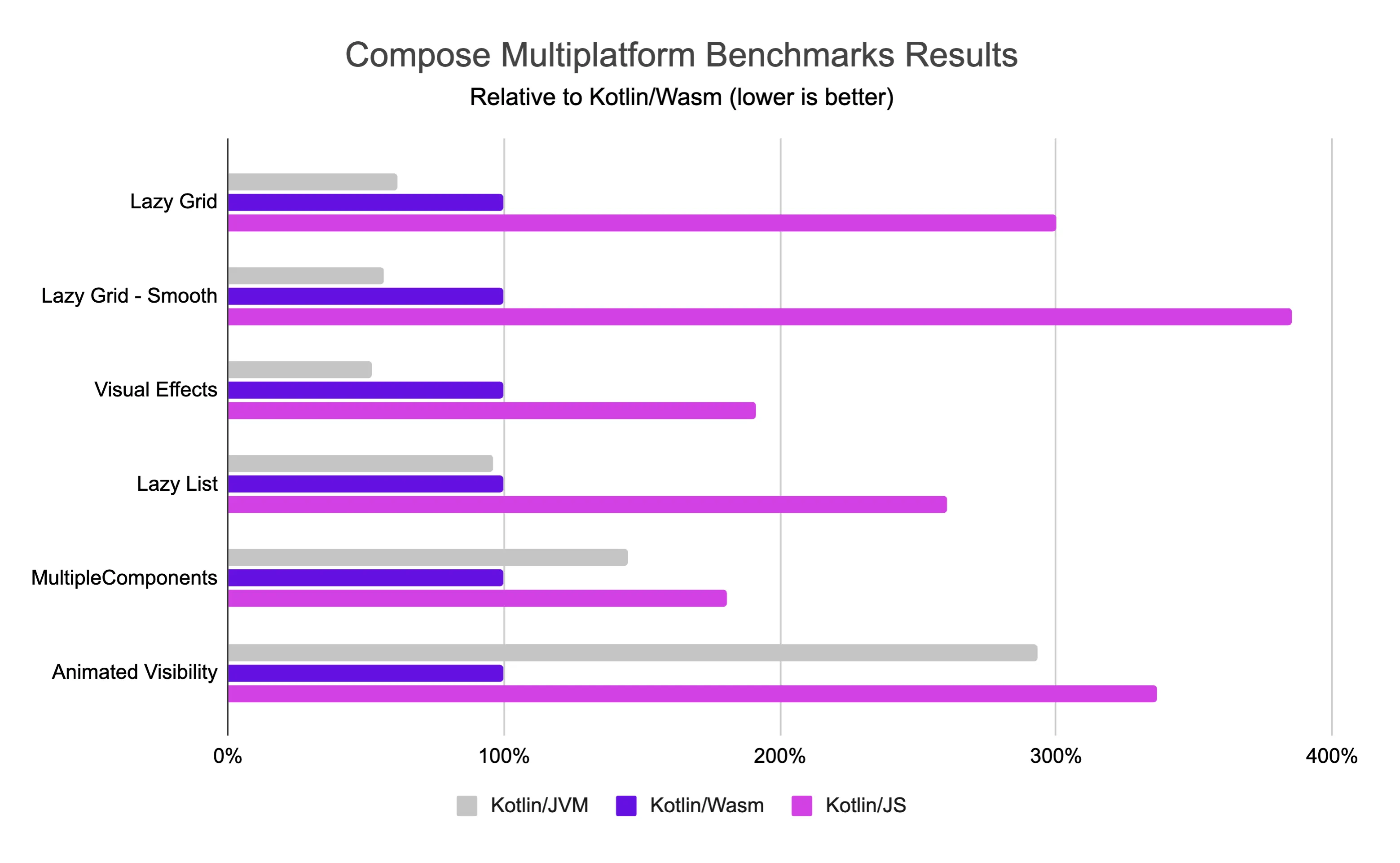 We regularly run benchmarks on Kotlin/Wasm, and these results come from our testing in a recent version of Google Chrome.