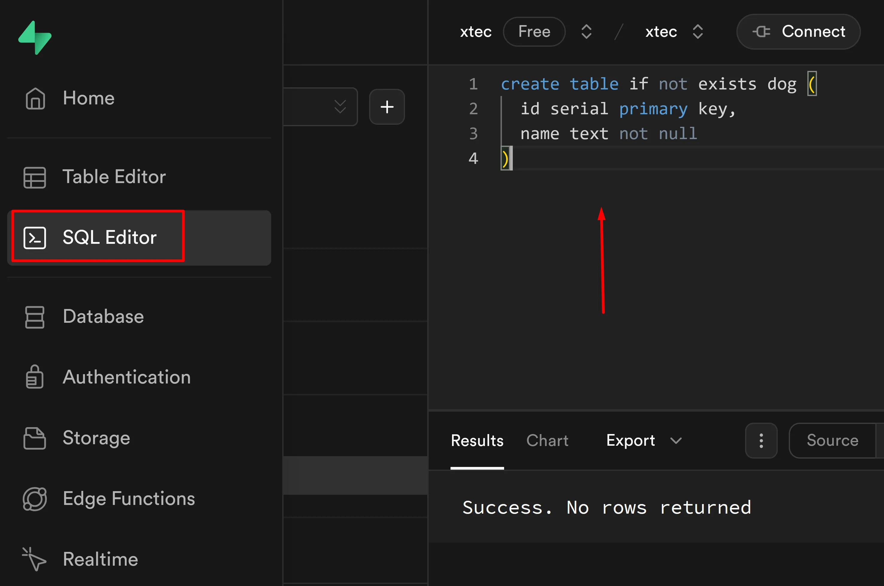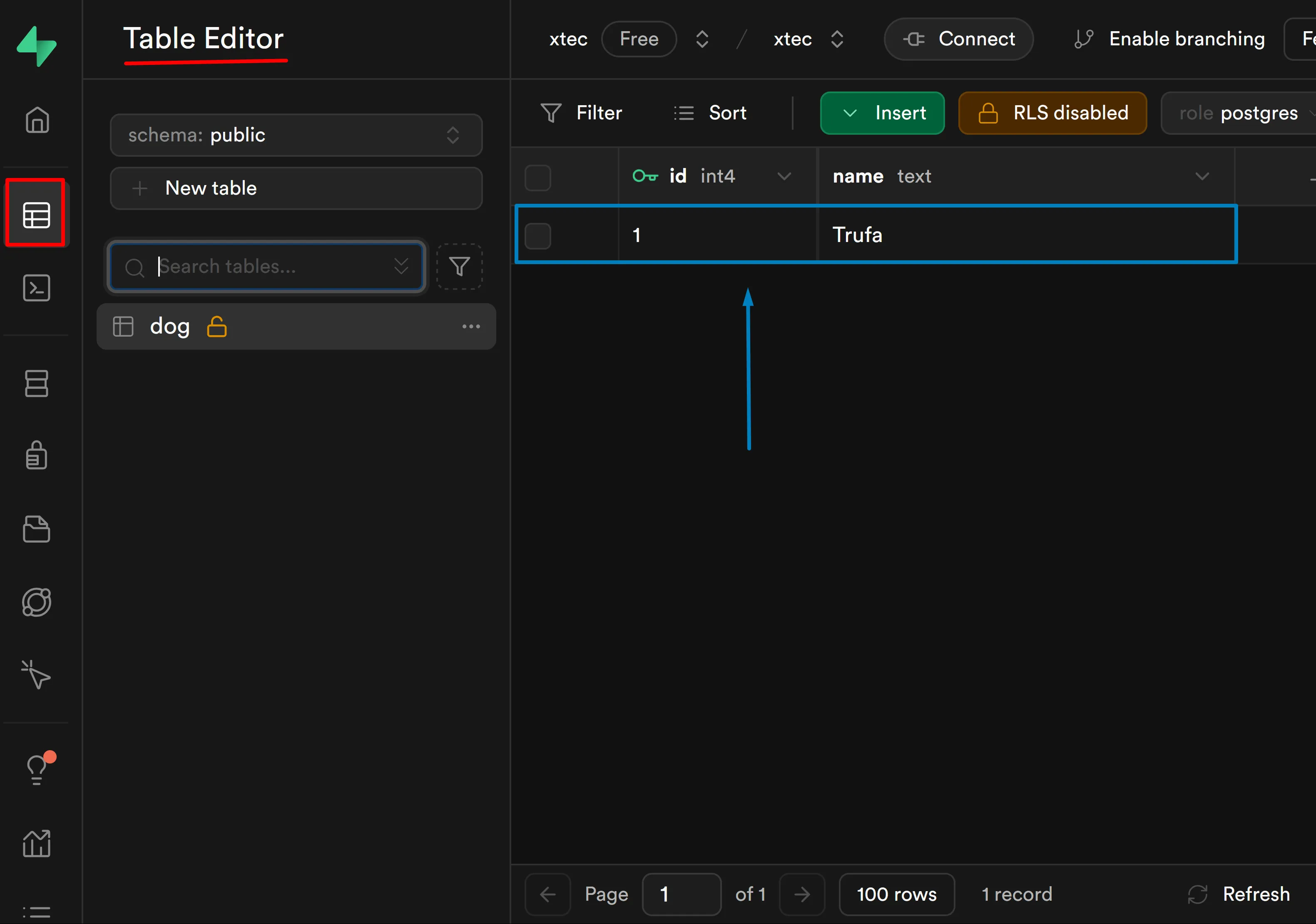 pg.from("dog").insert(DogInsert("Trufa")) }}Executa el codi i verifica al “Table Editor” que s’ha inserit el nou registre: