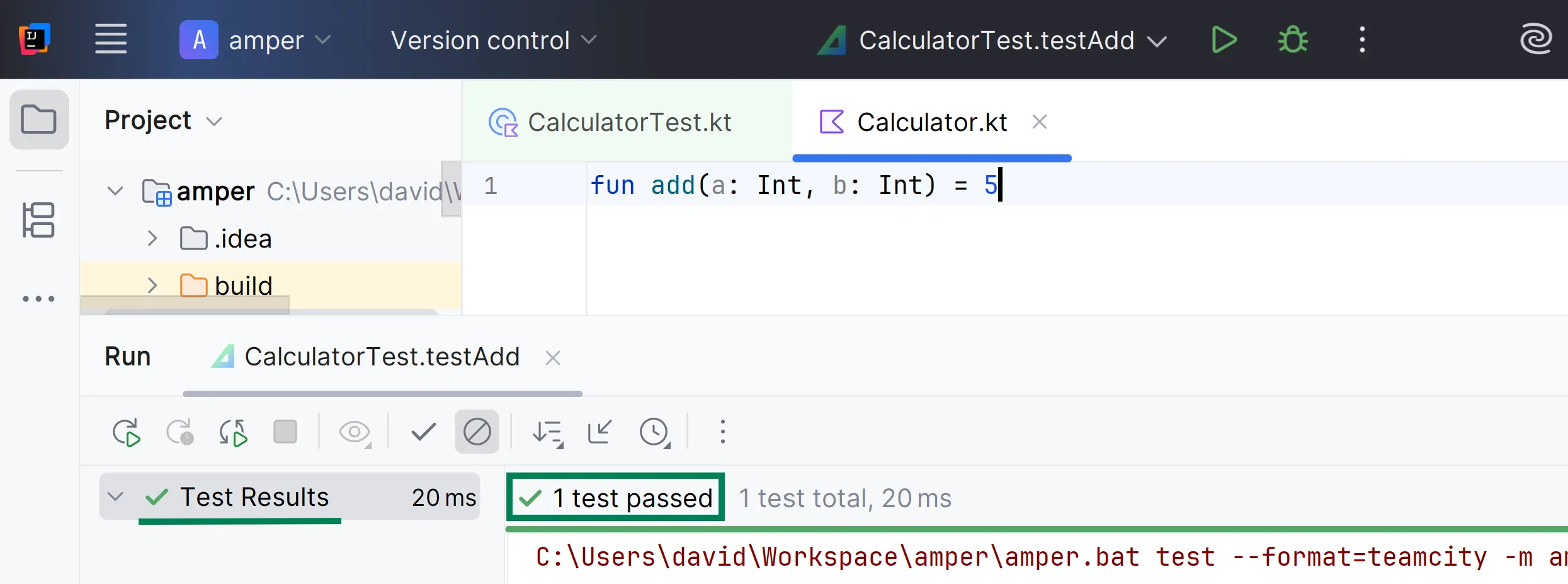 fun add(a: Int, b: Int) = 5Ara el test passa!