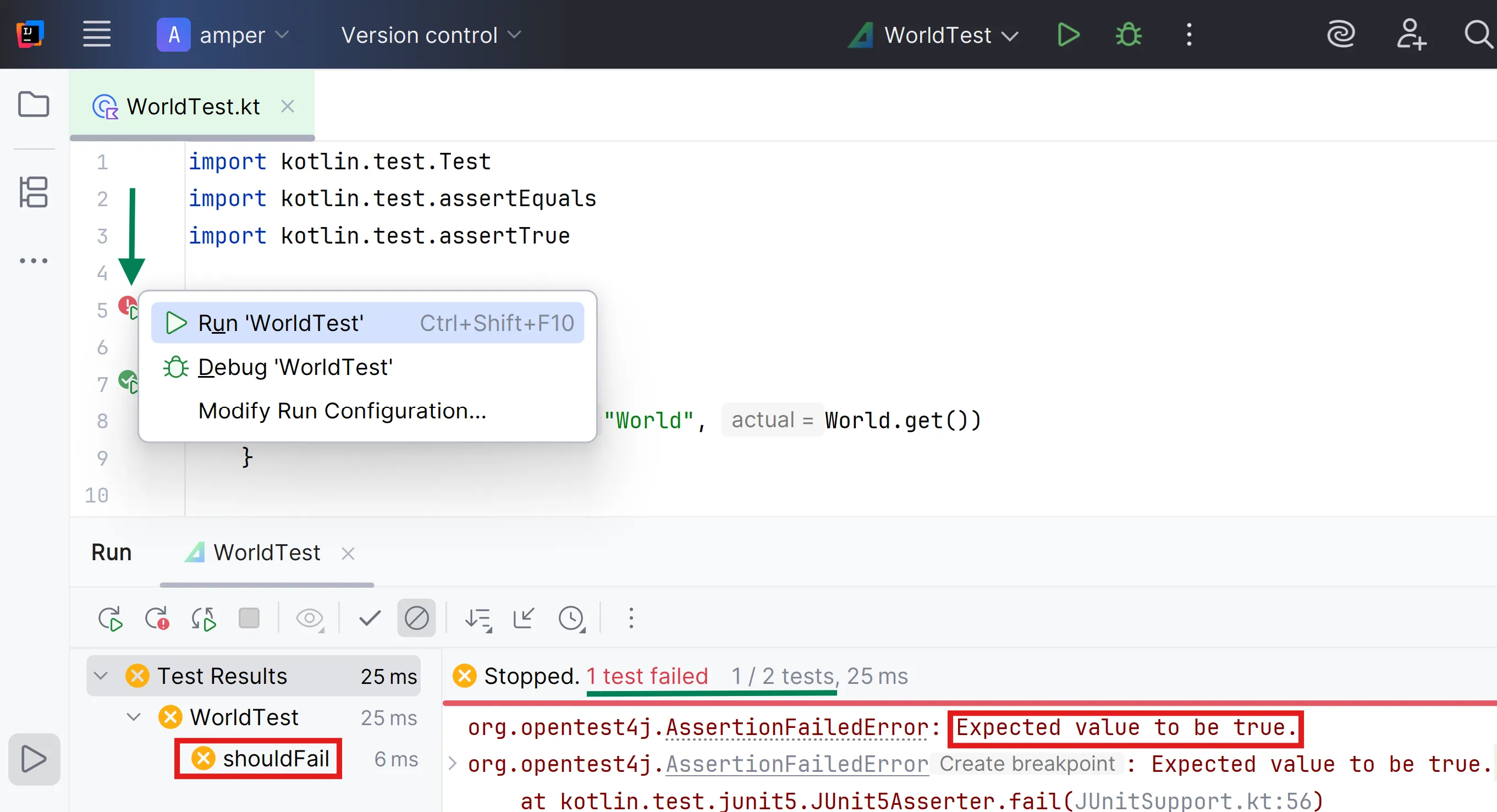 fun add(a: Int, b: Int) = 0Ara si executes el test, l’error és diferent, però el programa funciona!! 😺