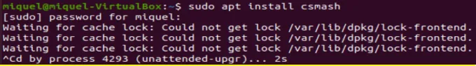 Waiting for cache lock: Could not get lock /var/lib/dpkg/lock-frontend. It is hWaiting for cache lock: Could not get lock /var/lib/dpkg/lock-frontend. It is hWaiting for cache lock: Could not get lock /var/lib/dpkg/lock-frontend. It is h^Cd by process 4293 (unattended-upgr)... 2smiquel@miquel-VirtualBox:~$ kill -9 4293⚠️ Heu de matar el procés que hi diu (en el meu cas té id 4293); no el que veieu a la captura! ⚠️