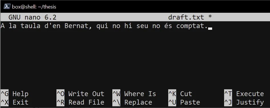 $ echo "Hola classe" > classe.txt$ ls classe.txtclasse.txt$ cat classe.txtHola classeIn many activities we will create files this way instead of using nano.