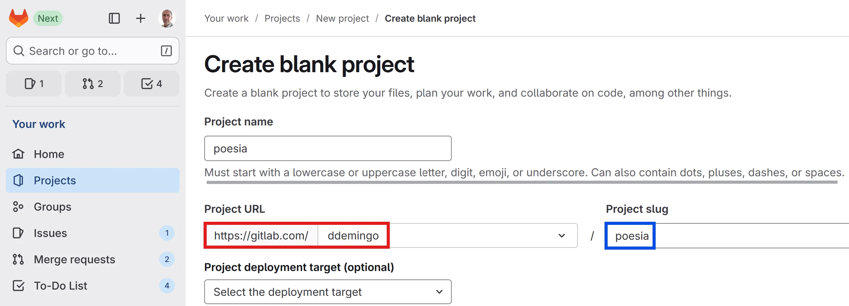 git clone git@gitlab.com:ddemingo/poesia.gitCloning into 'poesia'...remote: Enumerating objects: 3, done.remote: Counting objects: 100% (3/3), done.remote: Compressing objects: 100% (2/2), done.remote: Total 3 (delta 0), reused 0 (delta 0), pack-reused 0 (from 0)Receiving objects: 100% (3/3), done.Ja pots escriure la primera estrofa de la teva primera poesia: