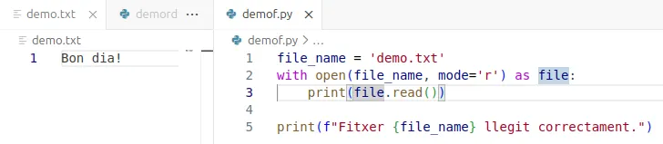 print("Fitxer demo.txt llegit correctament.")Altrament, el programa no interpretarà els accents ni altres caràcters é :