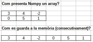 Una matriu consumeix menys memòria i és convenient fer servir. NumPy fa servir molta menys memòria per emmagatzemar dades i proporciona un mecanisme d’especificació dels tipus de dades que ens ajuda a prevenir errors.