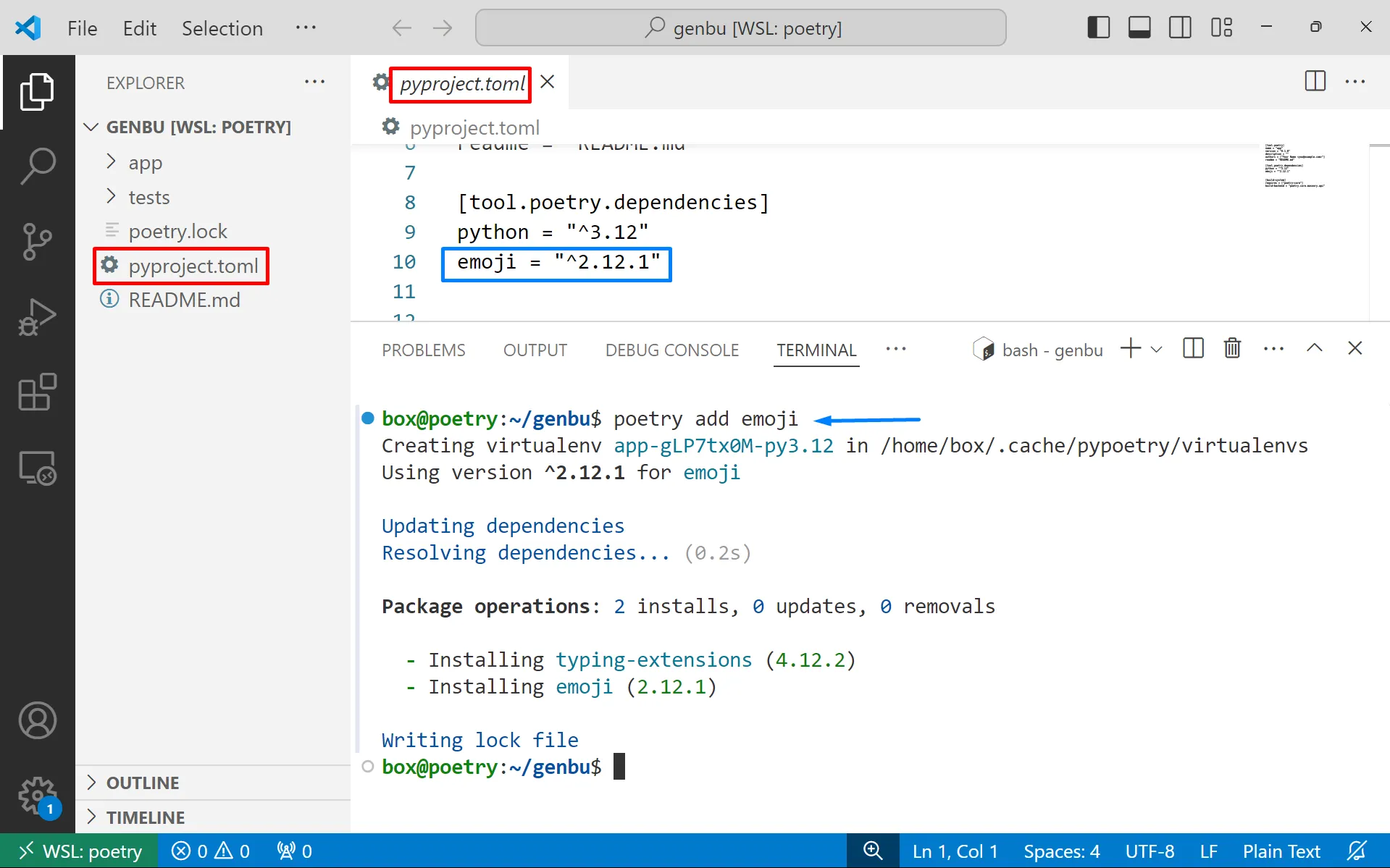 $ poetry add emojiPots veure que la secció [tool.poetry.dependencies] del fitxer pyproject.toml s’ha modificat: