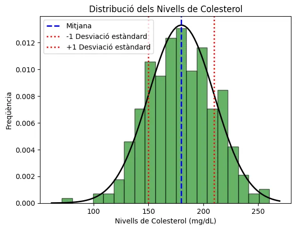 # Generar dades aleatòries amb una distribució normalcholesterol_levels = np.random.normal(mean, std_dev, n_samples)