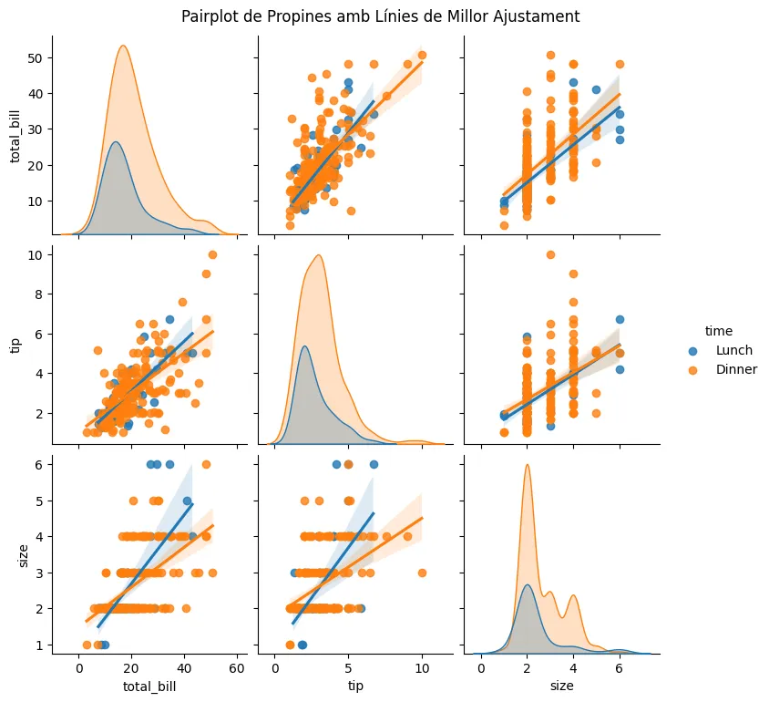 # Crear el pairplot amb línies de millor ajustamentsns.pairplot(tips, kind='reg', hue='time', diag_kind='kde', markers=["o", "s"])plt.suptitle('Pairplot de Propines amb Línies de Millor Ajustament', y=1.02)plt.show()
