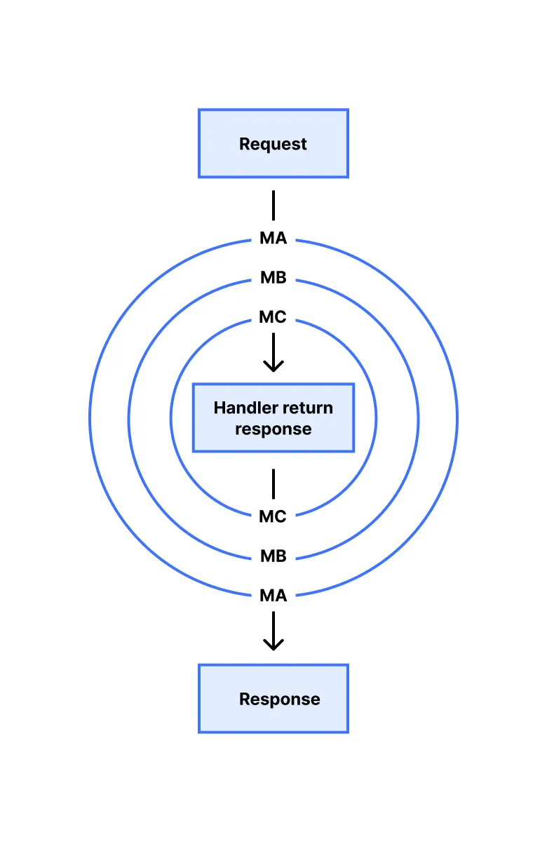 A handler is a place to write a function that receives a request and returns a response, as specified by the user. For example, you can write a handler that gets a value of a query parameter, retrieves data from a database, and returns the result in JSON. Middleware can handle the requests that come to the handler and the responses that the handler returns. You can combine middleware with other middleware to build more large and complex applications. It is structured like an onion.