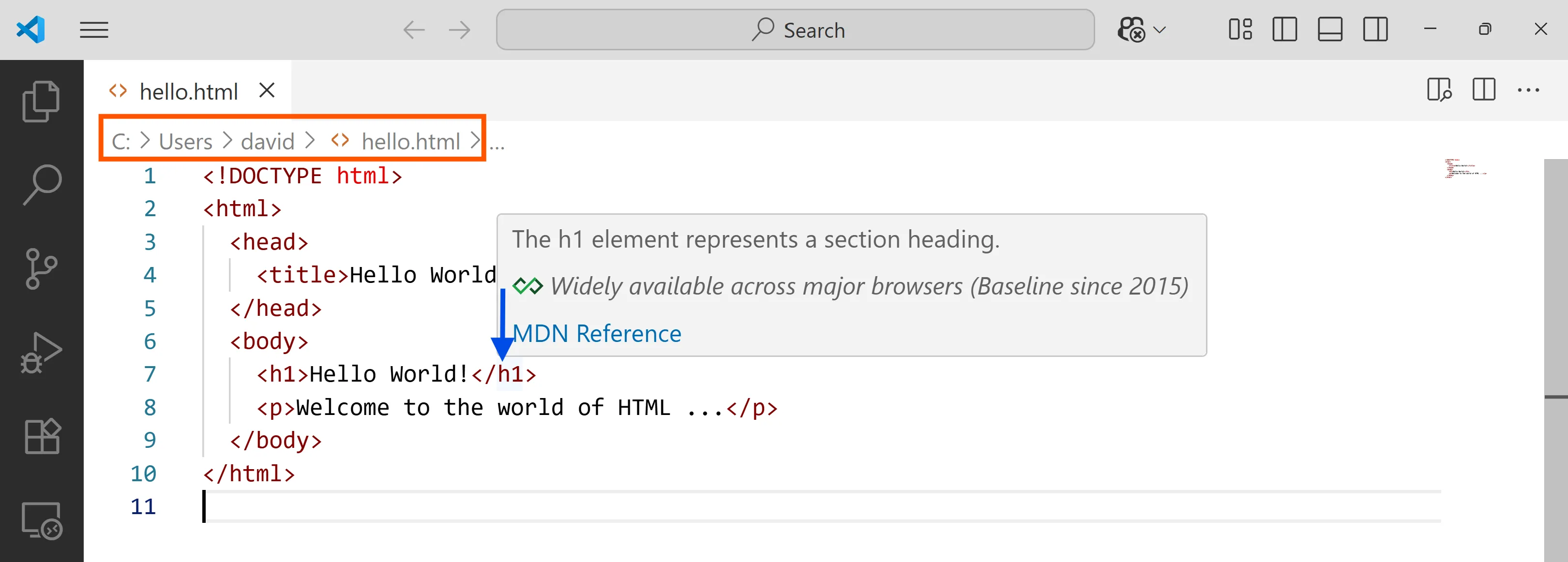 Per exemple, si poses el punter del ratolí sobre l’element h1 t’explica el seu significat: